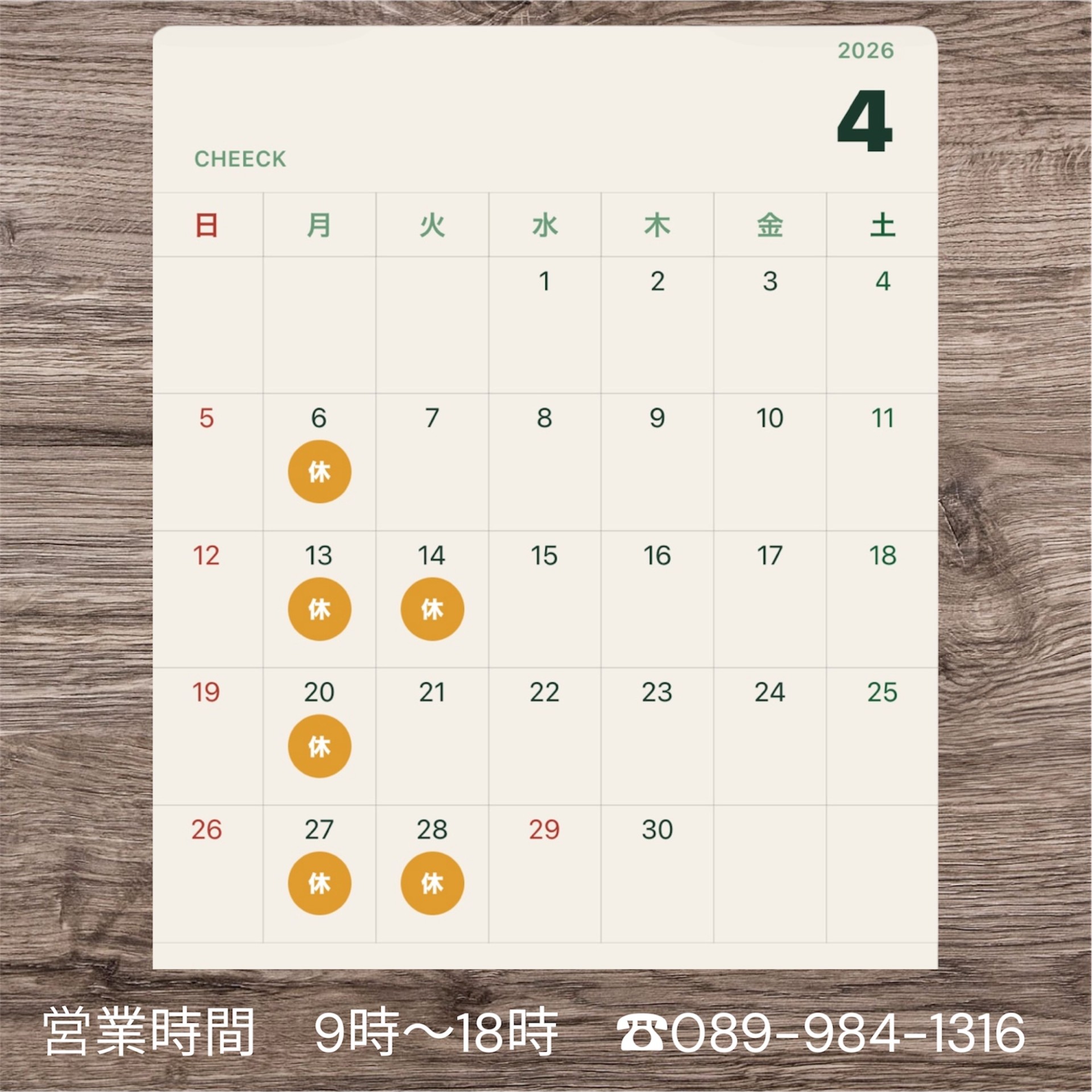 News/お知らせブログ 2026/04/10 2026年4月営業日カレンダー 2026/04/01 春の抜け毛対策は”頭皮から” 2026/03/03 【新導入】地肌から髪質を変える。次世代トリートメント「ルベルワン」で一生モノの美髪へ 2026/02/18 春カラーレシピ 2026 2026/01/01 あけましておめでとうございます 2025/12/01 年末年始のお知らせ 2025/10/28 福袋HAPPYBAG受付開始 2026 2025/10/15 SEASON RECIPE シーズンレシピ More